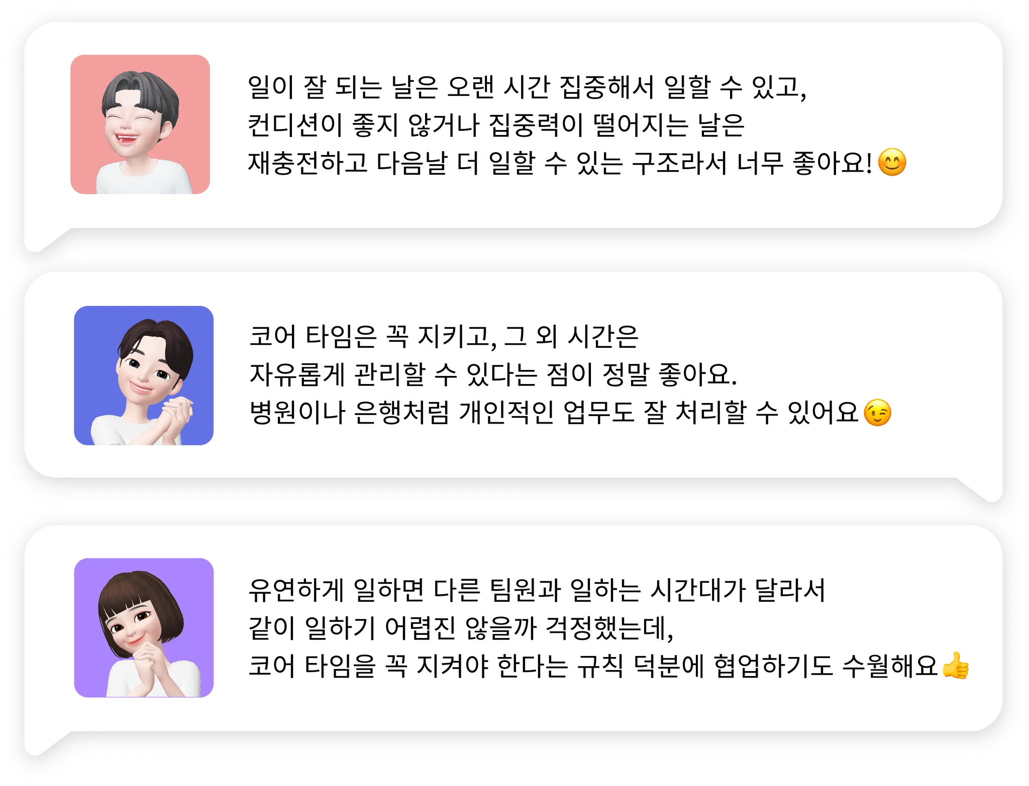 *일부 포지션은 코어타임을 다르게 적용해요. 자세한 내용은 포지션별 채용공고에서 확인 가능합니다.