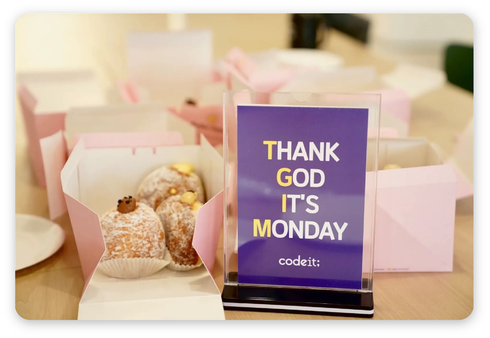 매주 월요일은 TGIM이 있는 날입니다! 한 주의 시작인 월요일을 기분 좋게 보낼 수 있도록 TGIM 이벤트를 준비하고 있어요. 샌드위치, 주먹밥, 도넛, 과일 등 맛있는 간식과 함께 행복한 월요일을 시작합니다