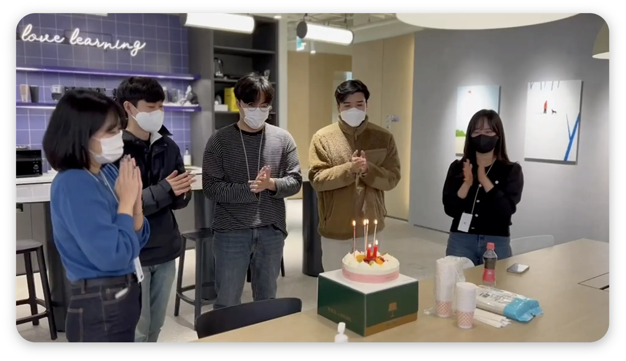 매월 첫째주 월요일 오후 4시는 생일 축하 시간입니다. 다함께 사내 라운지에 모여서 맛있는 케이크도 나눠 먹고 팀원들의 생일을 축하해주고 있어요. 생일 당일에는 소중한 팀원의 생일을 축하하는 마음을 담아 10만원 상당의 생일 선물을 드리고 있습니다.